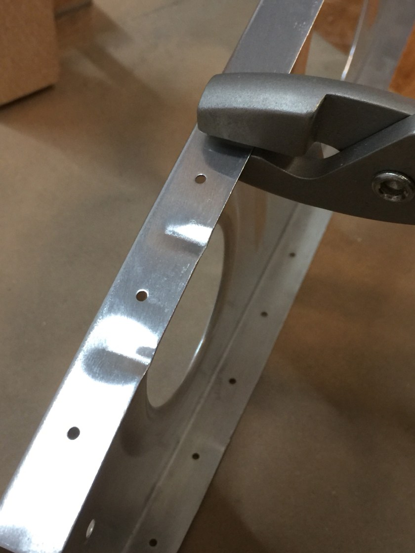 The forming process leaves ribs bowed, particularly the leading edge ribs. I straightened the webs with fluting pliers. I placed the center of each flute at the midpoint between the prepunched holes and used a straightedge or holes in a wing skin to check for straightness of the line of rivet holes. The straighter the parts, the better they fit.