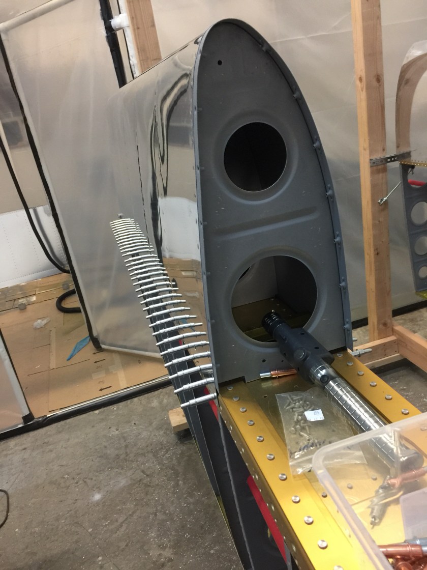 I then installed the fuel tank on the wing, with screws in every other hole, top, bottom and around the leading edge. I installed about half the bolts in the Z-brackets.