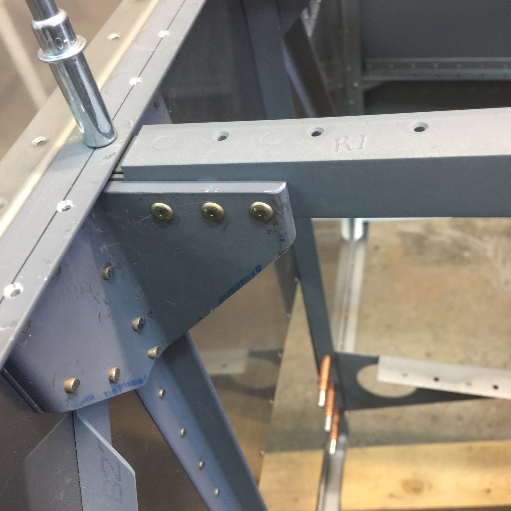 The skin was removed and the F-684 Gussets were riveted to the vertical firewall angles as shown on DWG 23, Detail A. I riveted the F-7101 Gear Attach Web to the F-902 bulkhead (DWG 23, Sect G-G’.)
