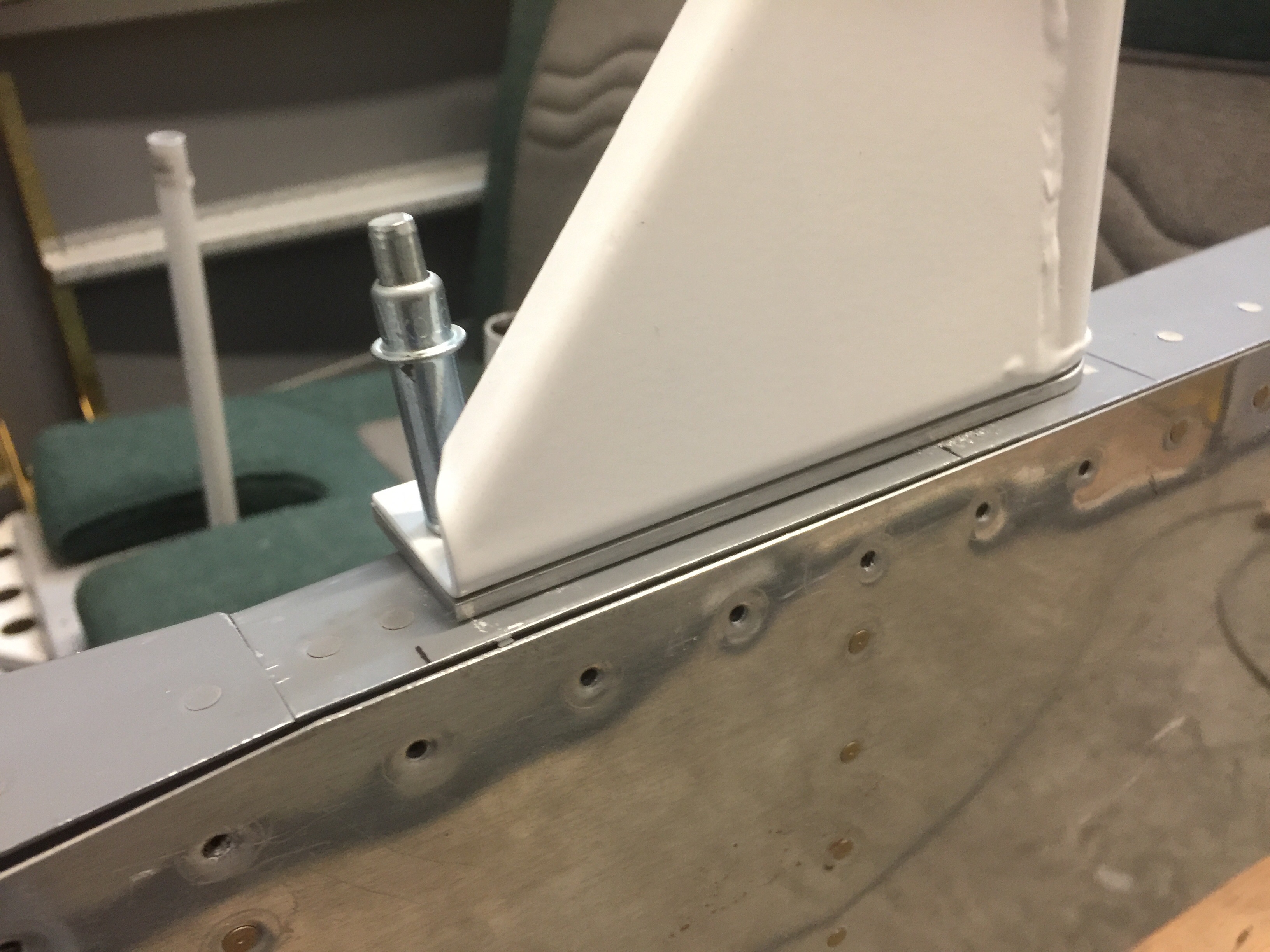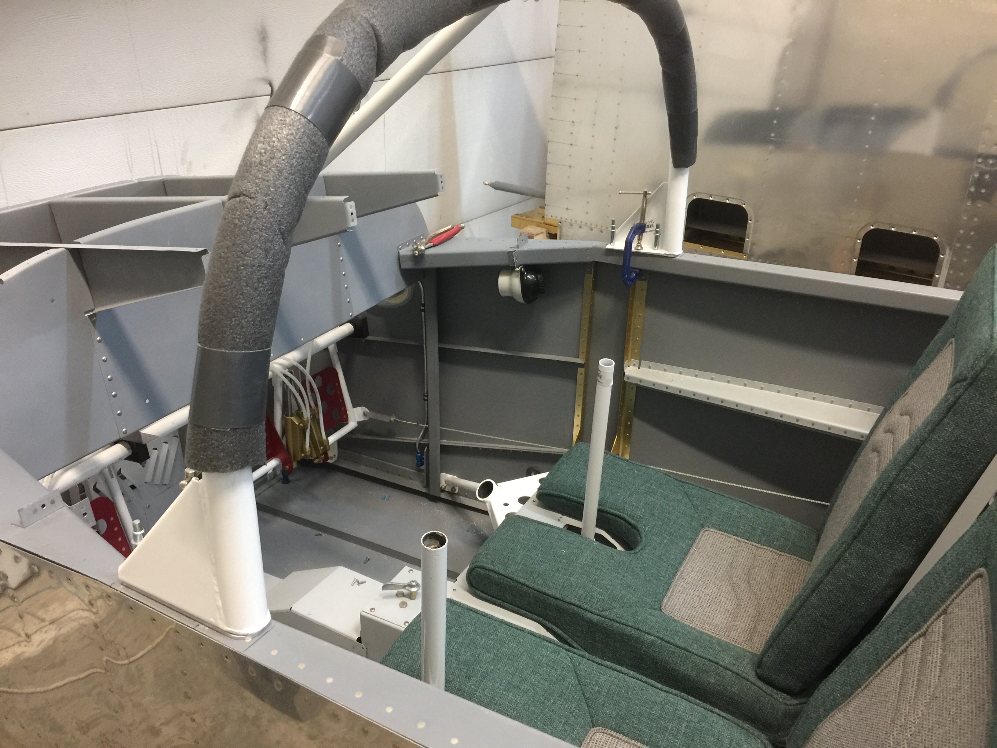 The roll bar needed to have a 7/32” gap between the fuselage sides and the outer edges of the bar. If the gap had been within 1/16” of desired, I could have pushed or pulled it into position, otherwise I would have had to bend it slightly to make it fit within 1/16”. It could be adjusted quite easily by hooking one end behind something and pulling (to make it wider) or by putting one end on the floor and leaning on the other (to make it narrower). I went very slowly, as it was easy to do too much.