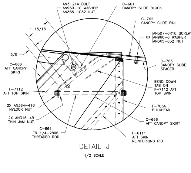 I drilled through C-661 and the canopy frame and inserted the bolt as shown in DWG 43, Detail J. Then I removed C-661 and de-burred the holes.
