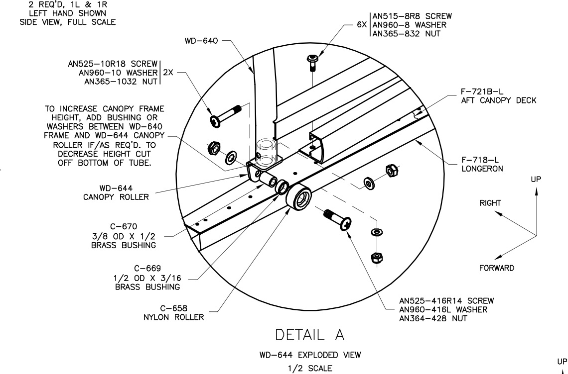 I assembled the Wd-644/C-658 roller assemblies (see DWG 41, Detail A) and inserted them into the tubes of the Wd640 Canopy Frame. Light clamping pressure with a small C-clamp held them in — I did not need to drill them to the frame until all canopy fitting adjustment had been made.