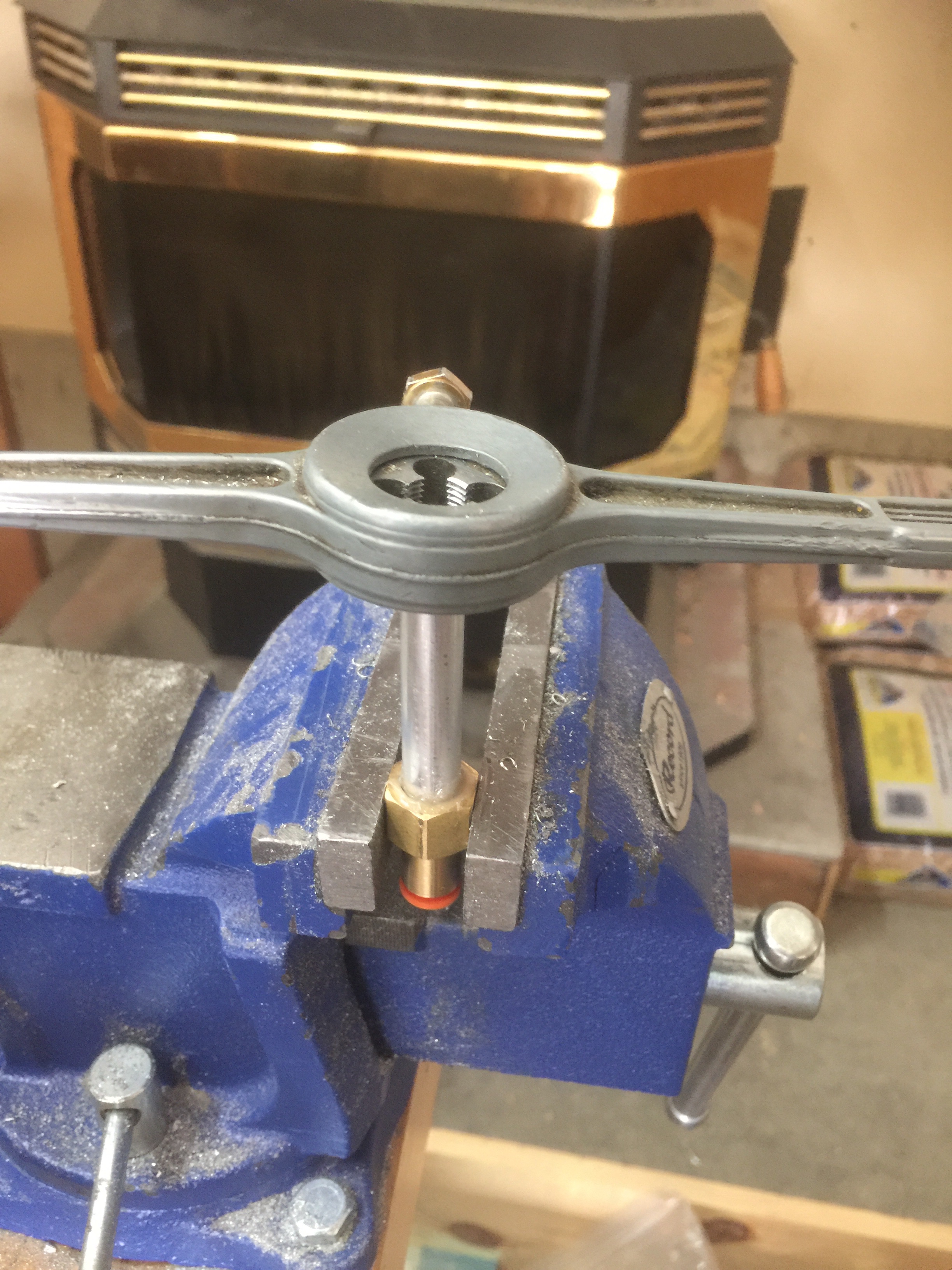 After the F-796A was bolted, temporarily, to the fuselage, the clamp could be removed. I located the center of the 1/4” hole on the flange of the angle, double checking to be sure that there was sufficient edge distance on both T-405 and F-796A. I drilled the 1/4” hole through T-405.