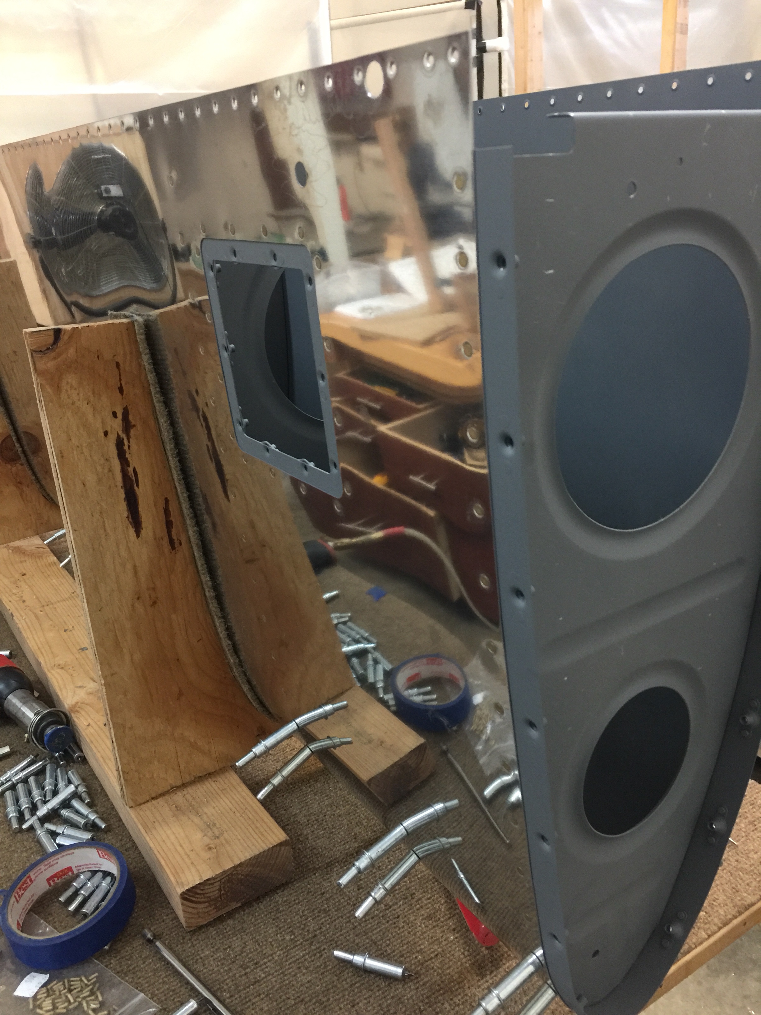There is a definite order in installing the wing skins. First, the leading edge (built off the wing) is installed. Then the top main skins are installed. The wing is then rigid enough to remove from the stand and install the ailerons, flaps and work on the internal details. After that is complete, the wing is laid, top down, on a large table and the bottom skins are riveted.
