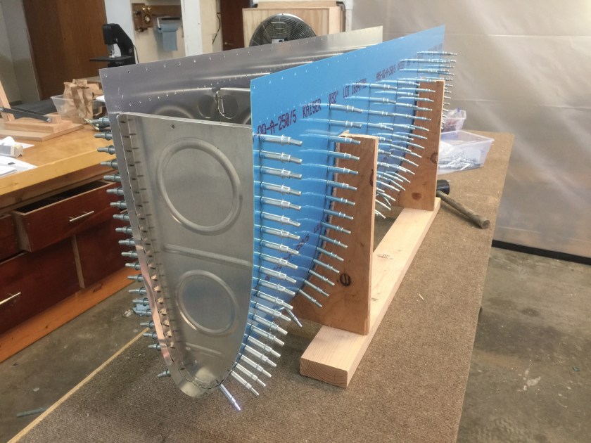 The tank is riveted together just like any other structure with one very important difference which is that sealant is applied between the parts to any seam through which fuel could conceivably leak including every rivet. I roughened all the mating surfaces using a scotchbrite pad. I scored the aluminum well, so the sealing compound will have more surface to grip. I cleaned the manufacturing residues and oils off all the rivets by sloshing them in a jar of solvent and drying them on a clean rag. I cleaned the mating surfaces of the skin, stiffeners and ribs including every surface that the sealer is applied to. It was essential that the surface of the aluminum be clean when the sealer was applied. Not just kind-of-clean or clean enough. Clean. After cleaning, I was careful to not pollute the areas to be sealed. I didn’t even touch them because oils from my skin would affect the bond of the sealant. The tank sealant was mixed as accurately as possible. This was done by weight following the instructions supplied with the sealant. When mixing sealant, I did not mix too much at one time. A batch the size of four or five golf balls was usually enough for one work session. The sealant provided 45 to 90 minutes of working time. I measured weight as accurately as possible and mixed it thoroughly before applying. In order to use the sealant as soon a possible, I had all the work well planned and the tools all laid out. I had the container of Xylene nearby for the frequent tool cleanings that were necessary during riveting. I was able can peel away overflow on areas that I wanted to keep clean by strategically applying plastic tape before spreading the sealant (such as along the areas of the skin that had to mate flush with the wing spar or splice plate). After thoroughly mixing the sealant, I used Popsicle sticks to apply an approximately 1/16″ thick layer to the parts being riveted. In the first work session I riveted on the stiffeners. Back-riveting worked well here, so I spread a thin layer of sealant on the inside of the skin, covering the area the stiffener will contact, and then inserted the rivets into the skin from the outside and taped them in. Then I pressed the stiffener into place. The sealant oozed out around all the stiffener edges. When the stiffener was firmly seated, I back riveted it permanently into place. Even more sealant squeezed out as the rivets set. I cleaned this away, making neat fillets around all the edges of the stiffener with the curved end of the Popsicle stick. Then I dabbed a bit of sealant over every rivet head.